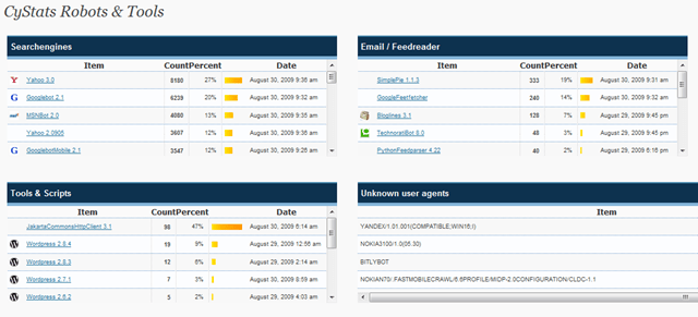 The Robots and Tools page is another summary of visits broken down by search engines; email/feed readers; tools and scripts and the unknown user agents: